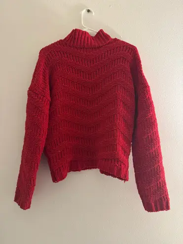 Bold red turtleneck sweater. Features a textured knit design. Very soft and cozy.