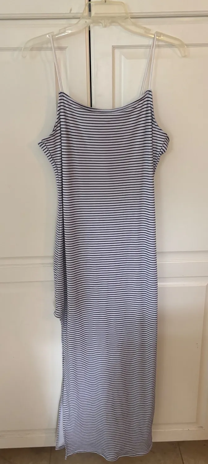 Effortless style meets everyday comfort with this Justify striped maxi dress. The classic navy and white stripe pattern creates a timeless look, while the adjustable spaghetti straps offer a personalized fit. A flattering side slit adds a touch of modern flair and allows for easy movement, making this dress perfect for transitioning from day to night. Imagine yourself strolling along the beach or enjoying a casual brunch with friends in this versatile piece. Ideal for vacation, weekend outings, or simply relaxing in style. Length 55". Pit to pit 18" Style: Slip Dress, Sundress, Maxi Dress Length: Long Department: Women Sleeve Length: Sleeveless Pattern: Striped Occasion: Casual, Party/Cocktail Fabric Type: Knit Theme: Bohemian Neckline: Scoop Neck Season: Summer, Spring Sleeve Type: Strappy Sleeve Closure: Pullover Accents: Strap Features: Stretch, Asymmetric Keywords: striped maxi, spaghetti strap dress, side slit dress, casual dress, beach dress, vacation dress, summer dress, resort wear, boho maxi, classic stripes, everyday dress, comfortable dress