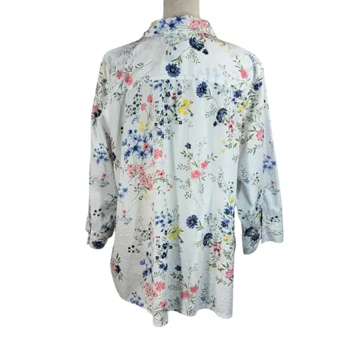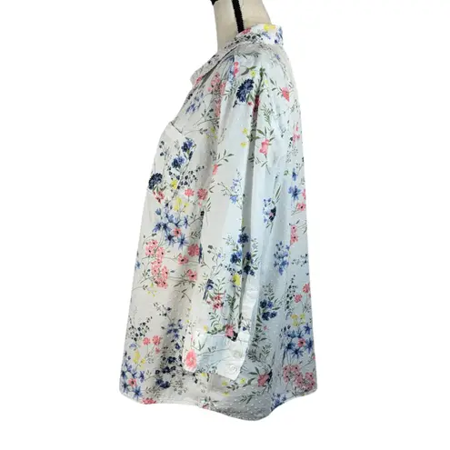 Karen Scott 2X-Large Top * Swiss Dot Fabric * Dark items may show through. * Floral * Button-Up * 3/4 Sleeves with Button Cuffs * Single Chest Pocket * Collared * No Stretch * White with Multicolor Print Please check the measurements to ensure a proper fit. Bust: 53 1/2" Length in the back from the shoulder to the hem: 28" Measurements are approximate, laying flat and unstretched. Smoke free home. Thank you for supporting our small business!