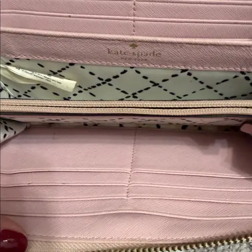 Elegant light pink wallet with zip closure. Features saffiano leather and gold-tone logo plate. Zip... Show more