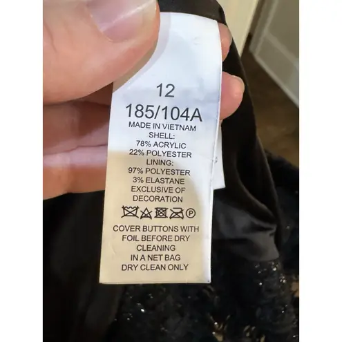 The product is a chic black coat by Kate Spade New York in size 12. It is made of a wool blend with pearl button closures, giving it a sophisticated and designer feel. The tweed fabric adds texture and interest to the overall design, making it a stylish addition to any woman's wardrobe. Perfect for adding a touch of elegance to any outfit, this overcoat is a versatile and timeless piece that showcases a blend of classic and contemporary style. 22228. 112125