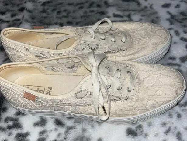 Off white colored sneakers Floral lace design Solid panels are semi sheer Lace up closure Platfor... Show more