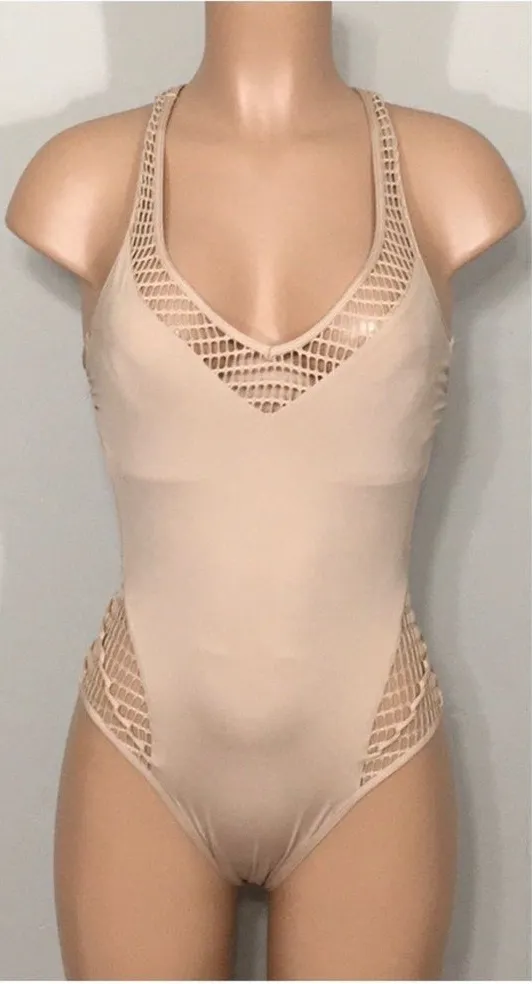 Kenneth Cole peach/nude racerback swimsuit. Woven swimsuit fabric in a “v” above the legs, around th... Show more