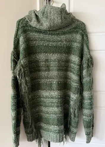 Excellent used condition. Boho green striped Kensie sweater with a cowl neck and fringe details. Per... Show more