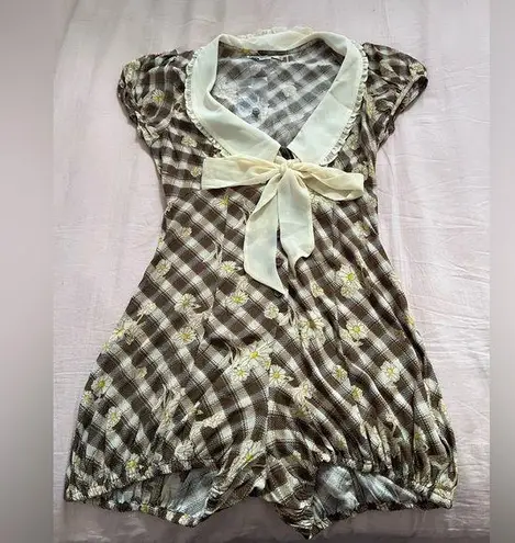 Charming romper with a checkered pattern. Features a cream collar and bow. Short sleeves and floral... Show more