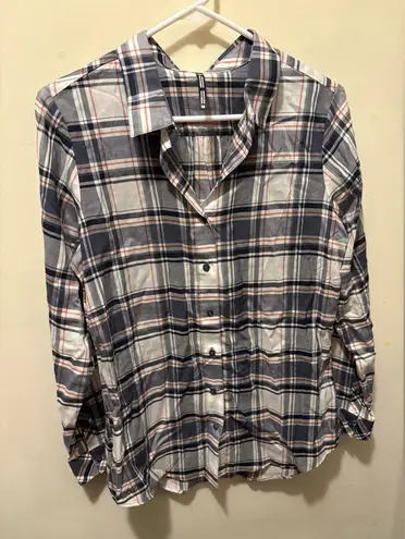 Stylish plaid button-up shirt with a classic design. Features a mix of blue, white, and pink colors. EUC - no flaws all buttons intact no signs of wear Ptp 19” Length front 27” back 30”