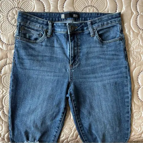 In good pre-owned condition Size: 6 Color: Medium Wash High rise Factory fading and whiskering Fi... Show more