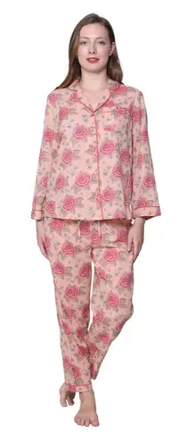 La Cera Cotton Print Pj Set in Peach Size Large Cropped pants with short sleeve button down paja... Show more