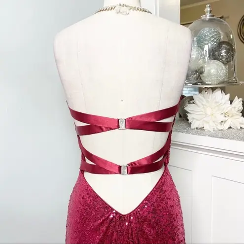 La Femme Red Sequin Strapless Waterfall Gown. Stunning dress sure to impress! Open back with criss c... Show more