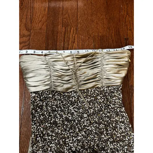 Stunning La Scala beige and chrome bodycon dress. This halter dress features intricate sequin and bead detailing, making it perfect for formal events. The dress has a stylish slit that adds a touch of elegance. adjustable due to back. Condition: READ. Please review all photos for details on condition. The dress is in overall good shape but may have some minor imperfections due to its delicate nature.ulti Scala gown, fully lined and beaded by hand! There is an area on the dress where it’s missing some beads, at the bottom (see photos! ) almost like whoever wore it didn’t have it hemmed so they stepped on it. You could just have the bottom hemmed and it would get rid of it. Perfect for parties, proms, or any special occasion where you want to shine. Grab this unique piece and make a statement!