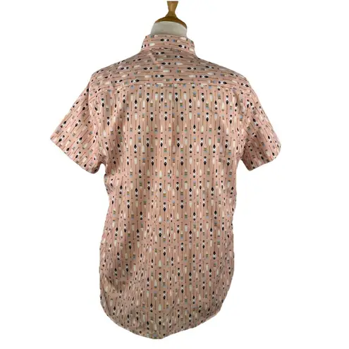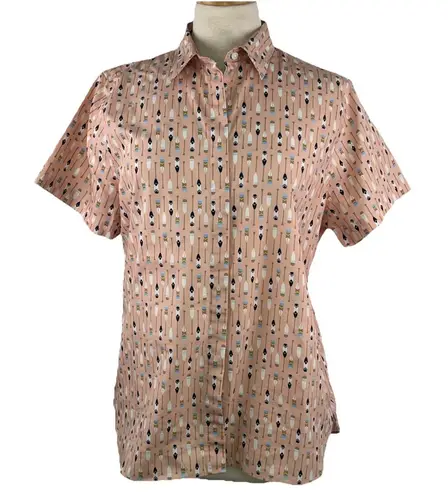 Short Sleeves Button front with hidden buttons Novelty print of colorful paddles / oars on a peach b... Show more