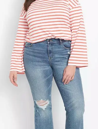 This Lane Bryant Signature Fit Flare Jean brings a touch of vintage cool with its destructed medium wash and flattering flared silhouette. Featuring stylish distressed details, rips on the left thigh and right hip/pocket, and a chic raw hem, these jeans offer a modern retro vibe. Perfect for making a statement, they blend comfort with on-trend style for any casual or bohemian-inspired outfit.