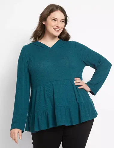 A cozy waffle knit top with a tiered hem for a flowy and flattering silhouette. Crew neck with hood... Show more