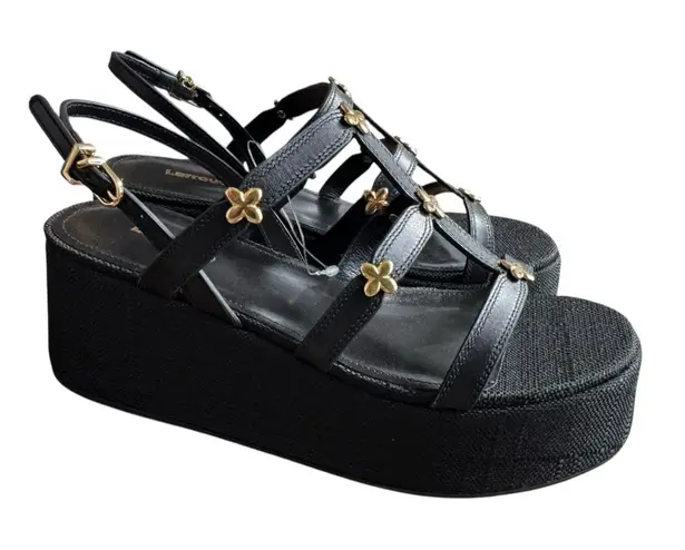 Brand new without box, never worn. Only been in a retail environment. Size: 7 Color: Black The Supers arrived to save all your looks: iconic Larroudé shapes, reimagined just for you. As soon as the weather starts to warm, we're swapping in our favorite sandals that were designed to wear every day...and every way. The Harmony Platform features a sleek mix of all of our favorite things in a super comfortable silhouette in a stylish mix of leather and raffia that we'll be wearing day in and day out. Black Calf skin leather and raffia fabric Open round toe Golden hardware Adjustable ankle strap 2.5 inch platform Perfectly fitted rubber sole for support, durability, and comfort Insole with memory foam cushion and hot stamp logo Handmade in Brazil