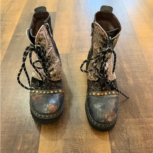 lartiste spring step ankle boots, spring step severe boots, womens leather patchwork boots, chunky heel ankle boots women, lace up leather boots, artistic leather boots women, fall winter ankle boots, euro size 37 boots, statement ankle boots women