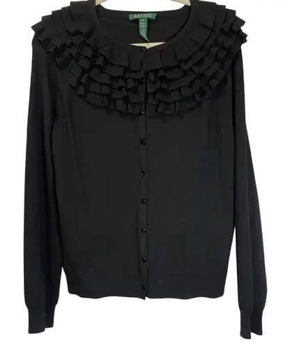 Lauren Ralph Lauren Silk Black Ruffle Button Down Cardigan Sweater Size Medium Beautiful sweater! G... Show more