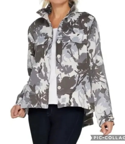Laurie Felt Grey Camo Hi Low Swing Jacket ~ soft denim like fabric, no material tag but it’s lyocel... Show more
