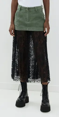 Le Superbe Seventythirty Utility Skirt - Size 6 New with Tags Color: Kush MSRP: $460.00 Lightweight, non-stretch denim Sheer lace underlay Button closure and zip fly Slant hip pockets and flap back pockets Shell: 100% cotton Lined Lining: 100% polyester Dry clean Made in the USA tags: designer, shopbop, revolve, midi, maxi, lace, utility, lacy, army, cargo, military, party, 90's, grunge, night out, casual, modern, city, rock & roll, concert, festival Size: Womens 6 Condition: New With Tags