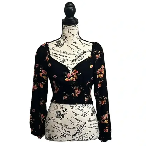 Leith women’s black floral smocked cropped blouse in size Small. Romantic, boho, fairycore, goth-ins... Show more