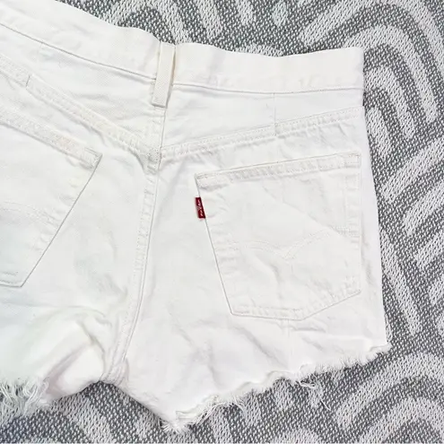 Women’s LEVI’S High Rise White Denim Altered 501 Cut Off Jean Shorts. Button fly. 5 pocket styling.... Show more