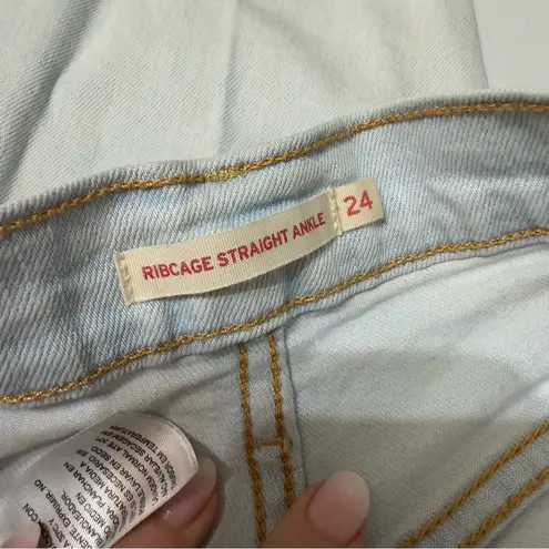 Women’s size 24 Levi’s Ribcage Straight Ankle Jeans in a light wash. Distressed knee. Small staining... Show more
