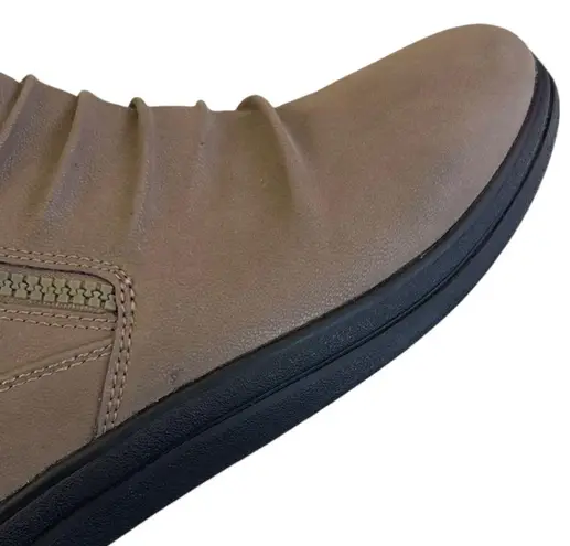 Worn once; Taupe faux leather (textile uppers; side zip; removable cushioned insoles; small mark on... Show more