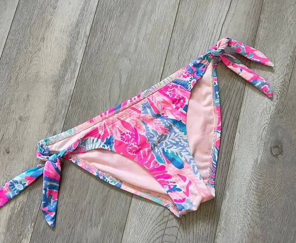 Lilly Pulitzer Guava Bikini Bottoms in the color pink and blue. Side tie detailing. Good coverage. S... Show more