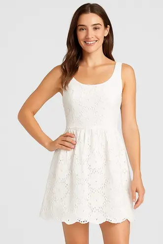 # Lilly Pulitzer dress, white eyelet dress, sleeveless dress, cotton dress, floral dress, size 0 dress, summer dress, casual dress, resort wear, preppy style, feminine dress, party dress, vacation dress, coastal style, Calhoun Style