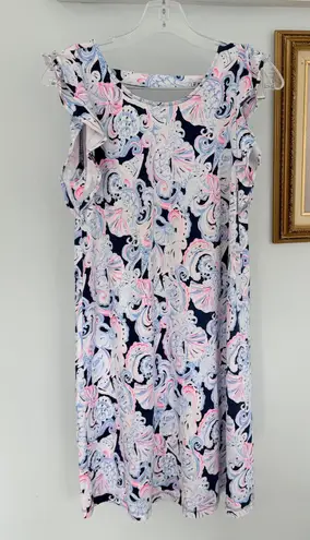 Lilly Pulitzer dress (S) with ruffle sleeves + keyhole back. Stretchy rayon blend, pink/blue paisley... Show more