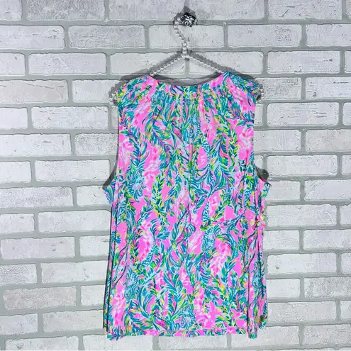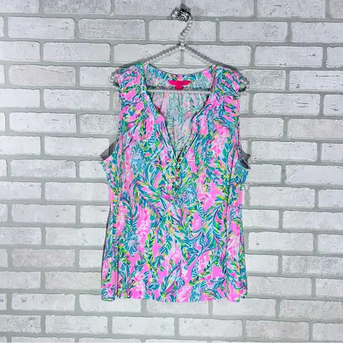 Vibrant sleeveless blouse with floral pattern. Ideal for warm weather outings. Easy fit Pullover s... Show more