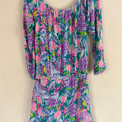 Chic dress with a vibrant pattern. Features pink and blue tones.