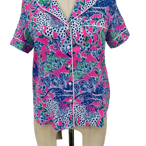 Brand new with tags Lilly Pulitzer PJ Woven Short Sleeve Top Plumeria Pink Untamed Hearts Print A co... Show more