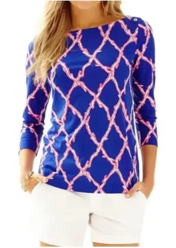 Lilly Pulitzer Santorini blue and deep dive pink, knit, 3/4 sleeve, boat neck top. Pairs well with s... Show more