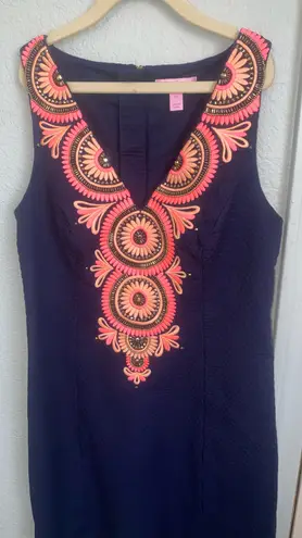 Lilly Pulitzer Size 0 Gabby Shift Cotton Dress True Navy Dress Pink Embroidery Gabby is the #Resort365 party dress you'll want to wear all season long. This solid dress is designed from the fit you love with the Janice dress with an updated feel. Basically it's a flattering dress with gorgeous prints and details - love. You've got the hook-up: built-in lingerie snaps make this dress bra-friendly. A girl need options: Enjoy an extra 1-3/4 inches of hem flexibility with this style. Wear as-is or let it out for some extra length. Blue - $79 - From Jean