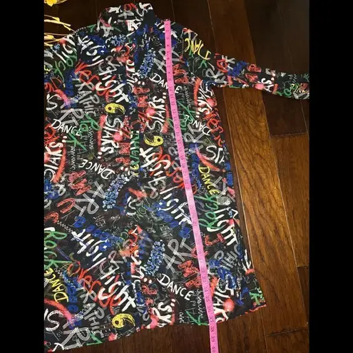 Live 4 Truth Black/ Colorful worded creative graphic (art/graphic/lights/override/stars/dance) button up Can be worn as a dress, half buttoned long blouse w/short shorts or leggings Sheer material High low Adjustable 3/4 sleeves sz medium measurements in photos NWT