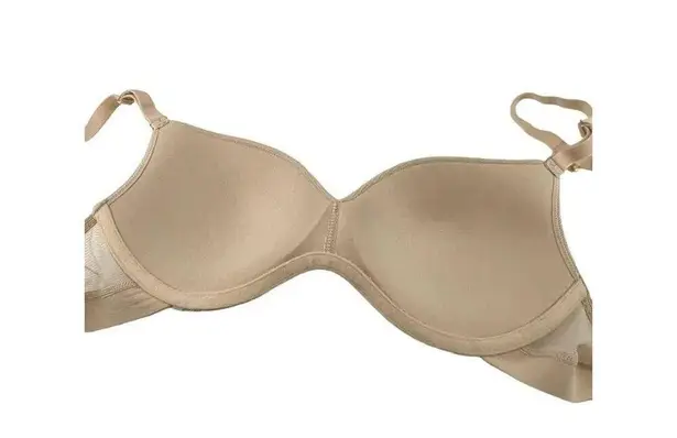 -Beige Palm Lace -Lace fabric smooth under tops -Elastic Bottom band for security and support -Smooth lace details on back straps -Front adjusting straps -Back J Hook for added support and racerback style -Darts on cups for added shape -Nylon/Spandex -34B Excellent Preowned Condition