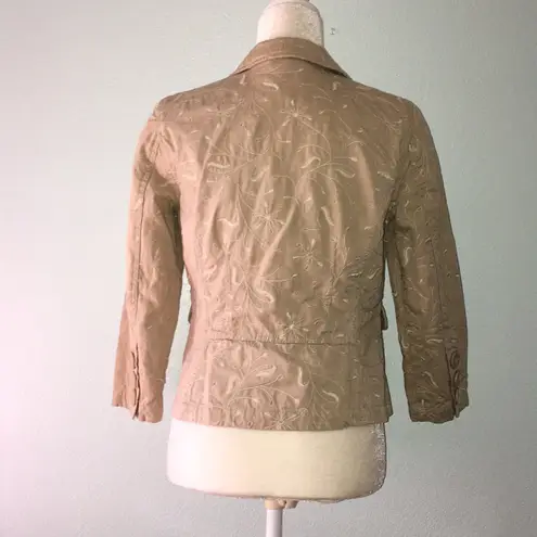 Tan blazer with embroidery. Front pockets. Buttons on the sleeves. One button on front. Great condit... Show more