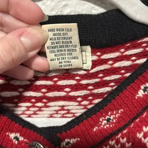Red and white snowflake fair isle design 100% lambs wool Decorative buttons Very festive Size la... Show more