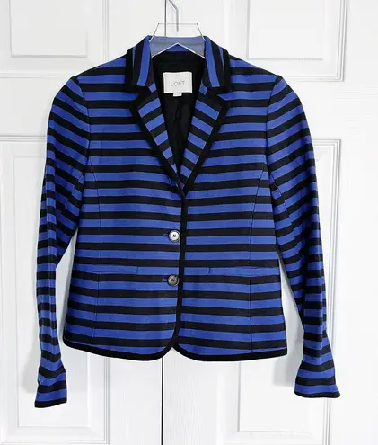 Textured fabric in blue and black stripes. Two-button closure. Lined. No stretch. Two welt pockets (still closed) Size 0 Excellent used condition Retails $139 preppy chic, modern professional, nautical style, office outfit, smart casual, bold stripes, blue and black jacket, tailored structure, business casual, minimalist workwear, timeless layering, lightweight blazer, classic fit, versatile outerwear, effortless polish, weekday wardrobe, trend forward officewear, refined statement piece, loft blazer, striped blazer