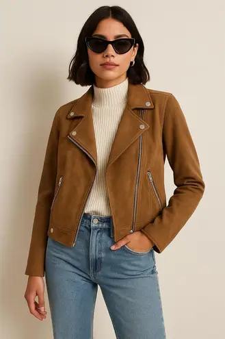 Chic and timeless Loft faux suede moto jacket in rich brown. Features a modern asymmetrical zip fron... Show more