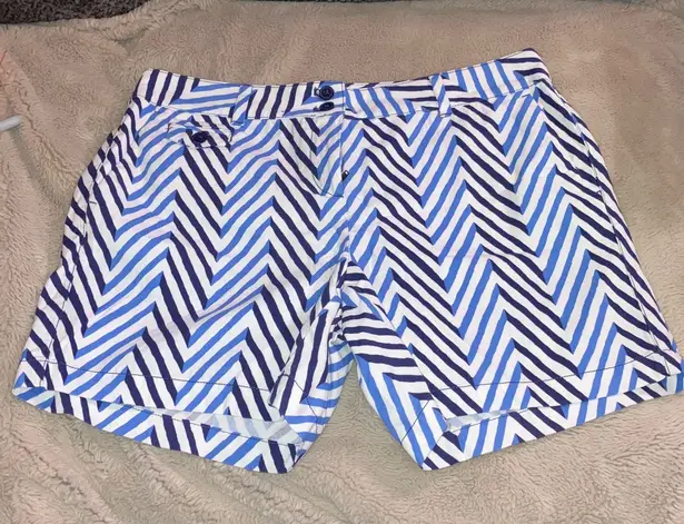 743: LOFT Patterned Shorts Size 10 White with navy and blue geometric pattern Button and zipper fly... Show more