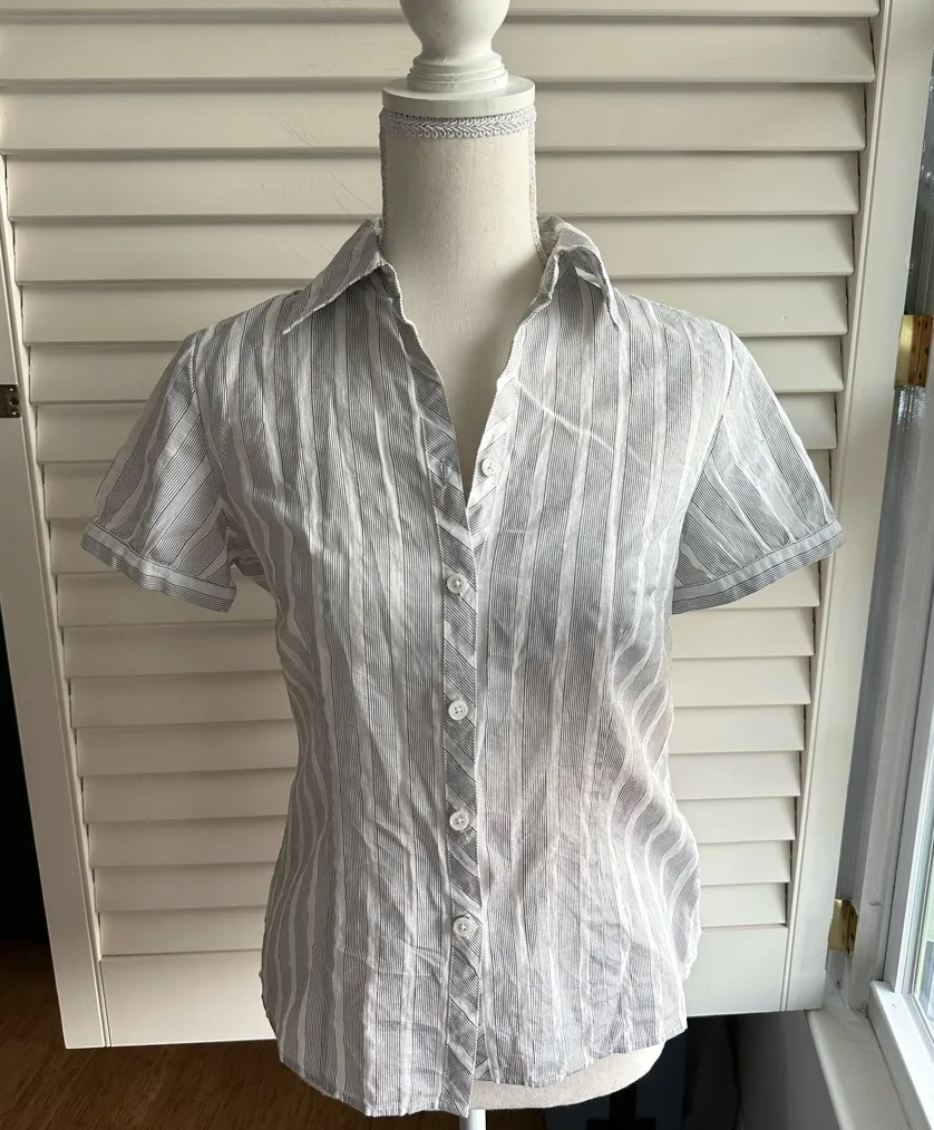 Cute white and grey striped button-up shirt with rounded sleeves #preppy #summer white, striped, bu... Show more