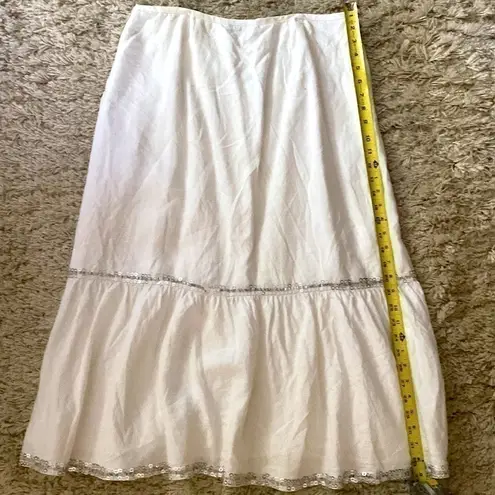 White linen ruffle midi skirt with silver trim. Size 10. Fully lined. 32 “ long with ruffle. Side zi... Show more