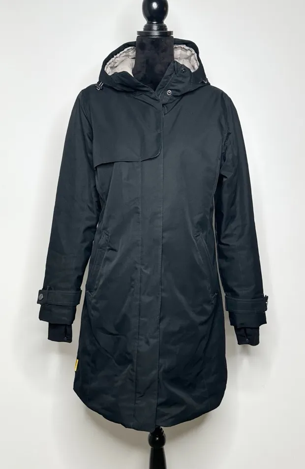 This is a versatile, long-length insulated parka/jacket from LOLE, perfect for staying warm and dry in transitional weather or cold climates. The black color and sleek design make it ideal for both city and outdoor wear. • Attached adjustable hood with embroidered LOLE logo on the back. • Full front zipper closure with a snap-button storm flap. • Adjustable snap cuffs over fitted inner wrist gaiters with thumbholes for extra warmth. • Front hip pockets for storage. • The shell is 100\% Polyester with a 100\% Polyurethane membrane, and the insulation is 100\% Polyester. Excellent pre-owned condition. Worn sparingly, showing very light signs of wear. No stains, rips, tears, or noticeable flaws. Zipper, snaps, and all toggles are fully functional. From a clean, smoke-free home. Size Large. Pit to pit: 22” Shoulder to hem: 35” Smoke free home.