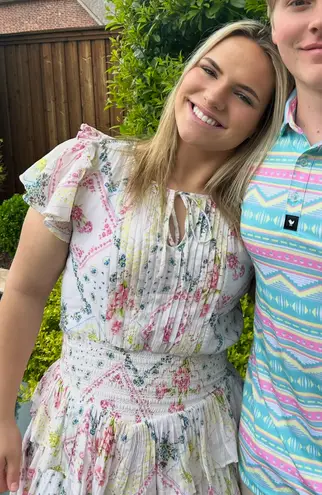 Super cute summer dress Front has a tear but you wouldn’t be able to tell looks like it’s supposed t... Show more