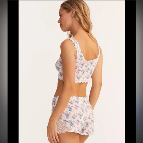 Charming floral pajama set with lace trim. Features a crop top and shorts. Perfect for lounging.