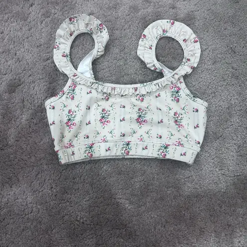 Floral patterned creamy beige leggings with matching ruffled bra Size XXs top and XS bottom Very g... Show more