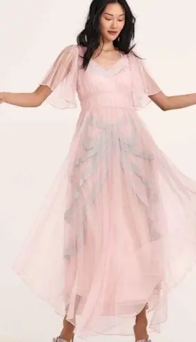 Size 0 // XS Excellent condition- no flaws Peach color Tulle ribbon details Ruffle-trim top Flow... Show more