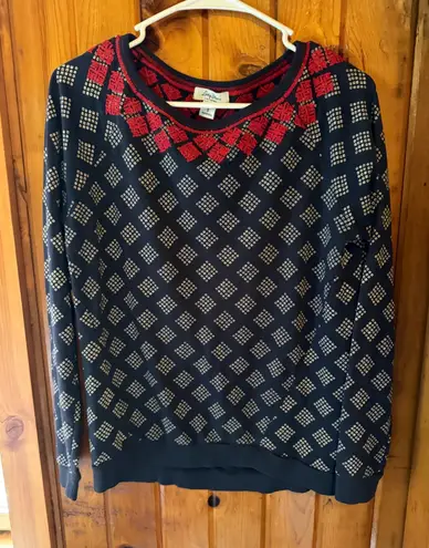 Stylish long sleeve pullover top from Lucky Bliss Features an eye-catching black color adorned with a geometric diamond pattern in beige. The red embellished detailing around the neckline adds a touch of sophistication. A comfortable and versatile addition to any wardrobe, perfect for casual outings, weekend brunches, or relaxed evenings at home. Preowned in good condition Keywords: Lucky Brand, Womens Top, Long Sleeve, Pullover, Embellished, Geometric Pattern, Casual, Comfortable, Bohemian, Crew Neck, Sweatshirt, Small