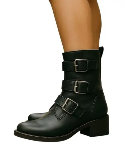 Lucky Brand black leather riding boots feature triple buckle straps and a side zip for ease. Perfect... Show more